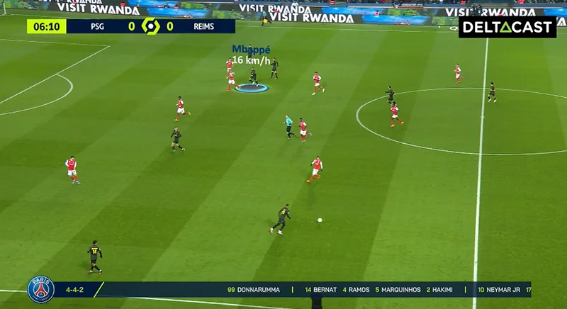 With DELTA-live, you can enhance a live camera feed with elements such as animated 2D/3D logos (team flags or advertisements), statistical data from STATS PERFORM, scores, the 9.15m free-kick circle, distance measurements to the goal, and sponsor logos or video clips directly on the pitch. This provides broadcasters with a unique opportunity to generate additional revenue from their sponsors.