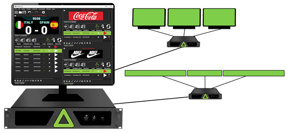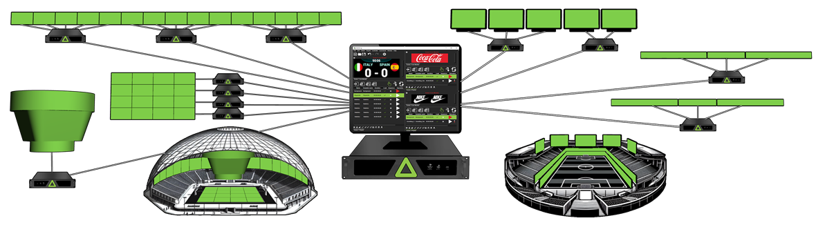 DELTA-stadium is designed to handle all types of screens, no matter their shape or size. Regardless of the number or type of screens, the system ensures perfect synchronization across all display devices. It also seamlessly integrates audio and lighting with visual displays to create a fully immersive experience.